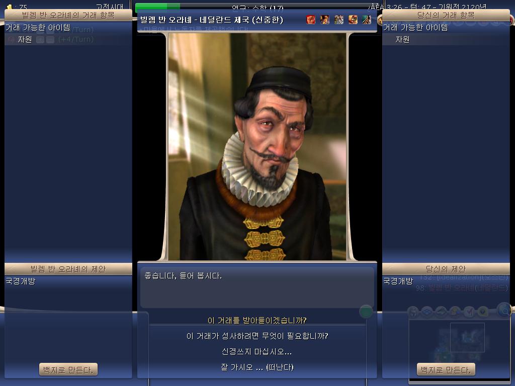 적진을 정탐하기 위해 서로의 국경을 개방합니다. 현재 사실 네덜란드 문명의 영토를 파악치는 못했습니다.