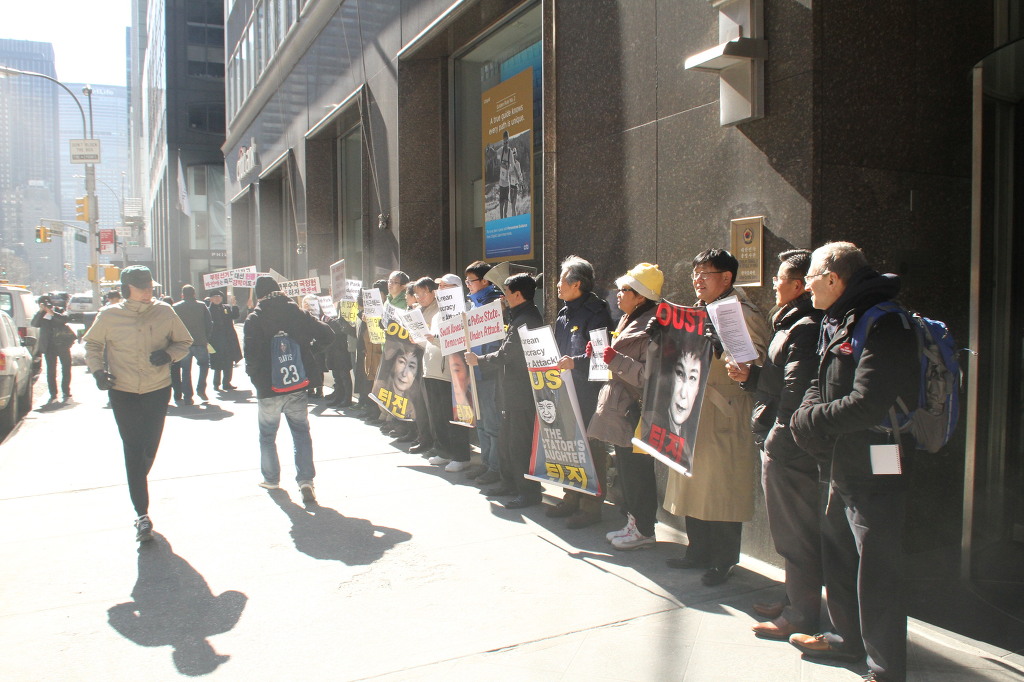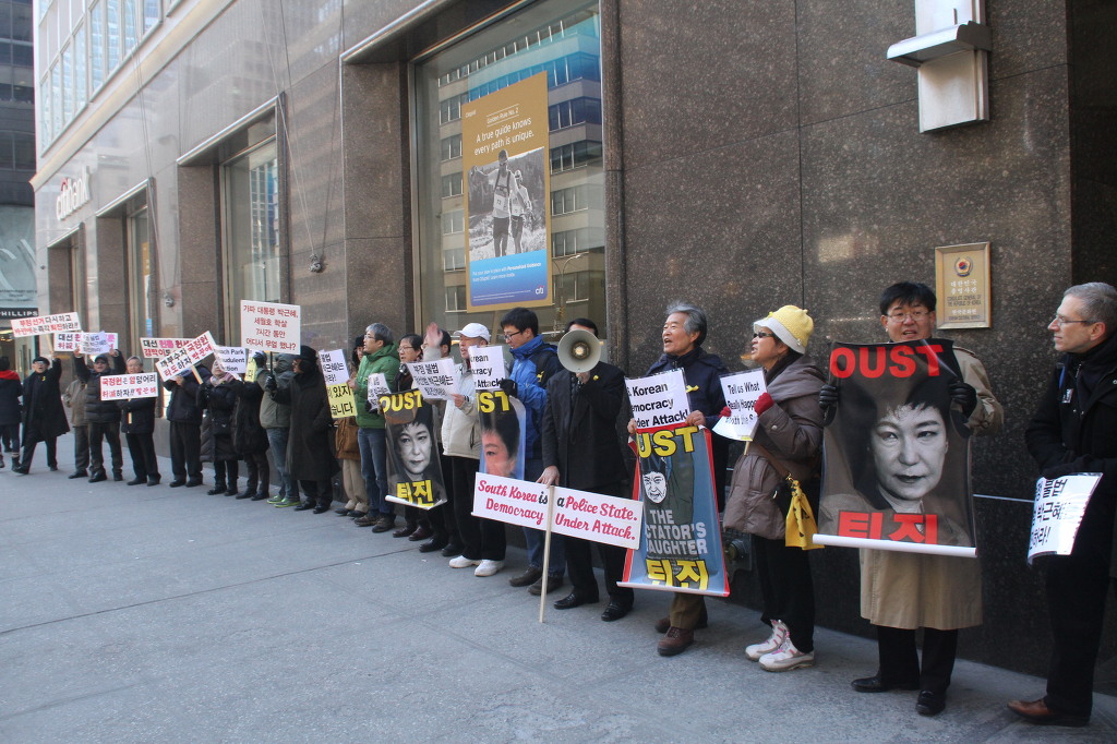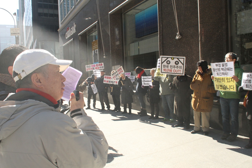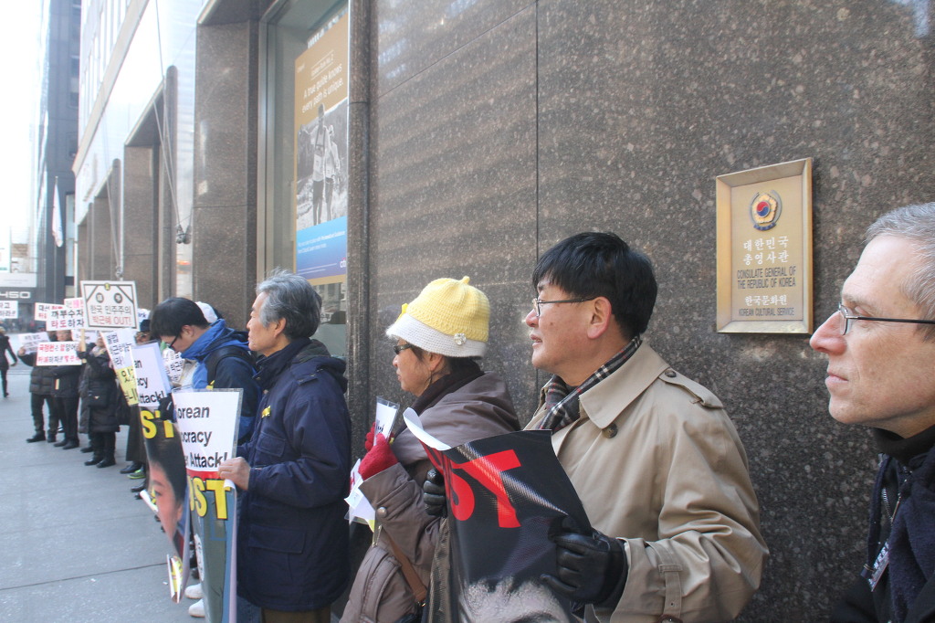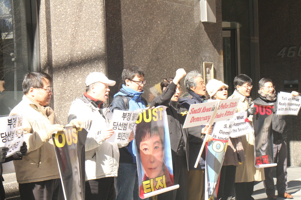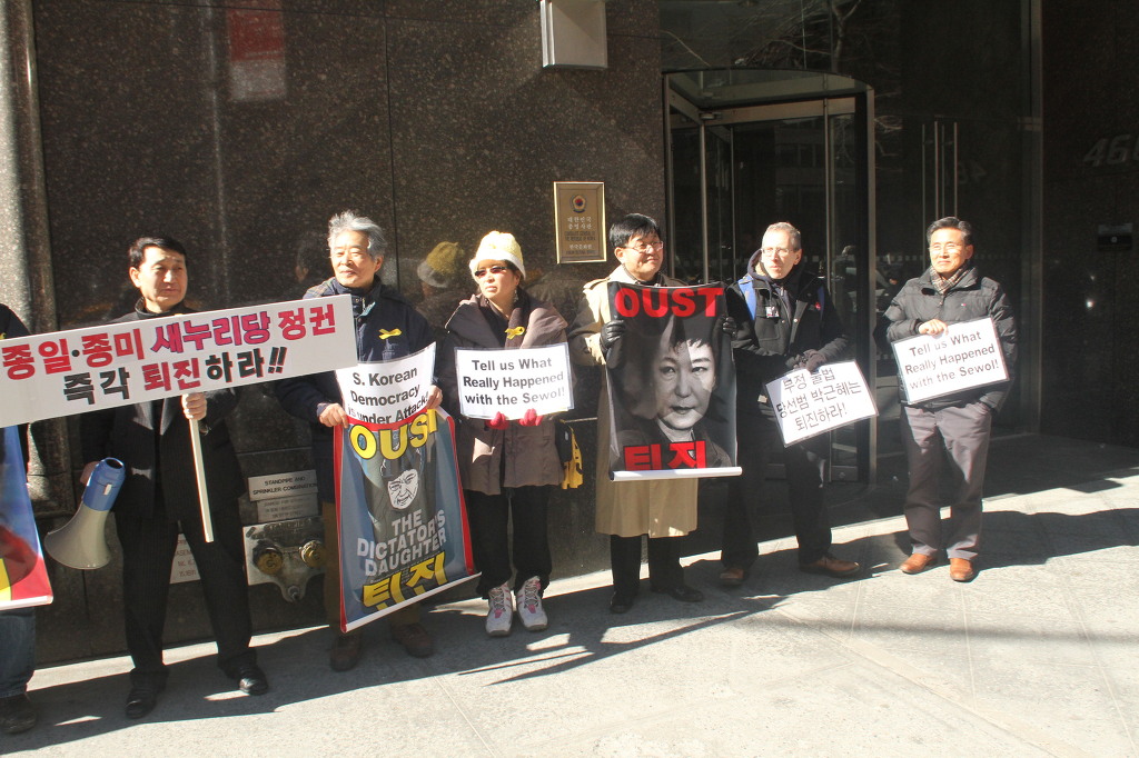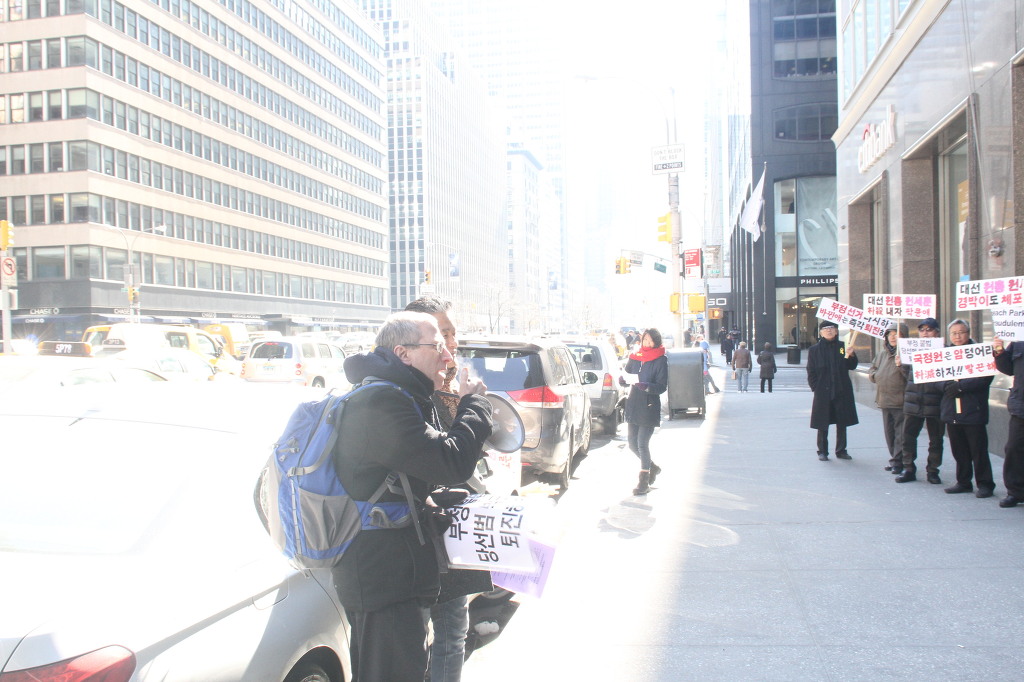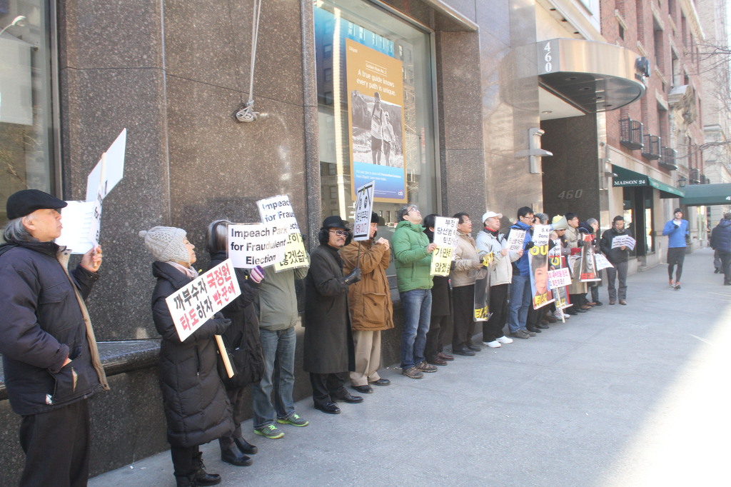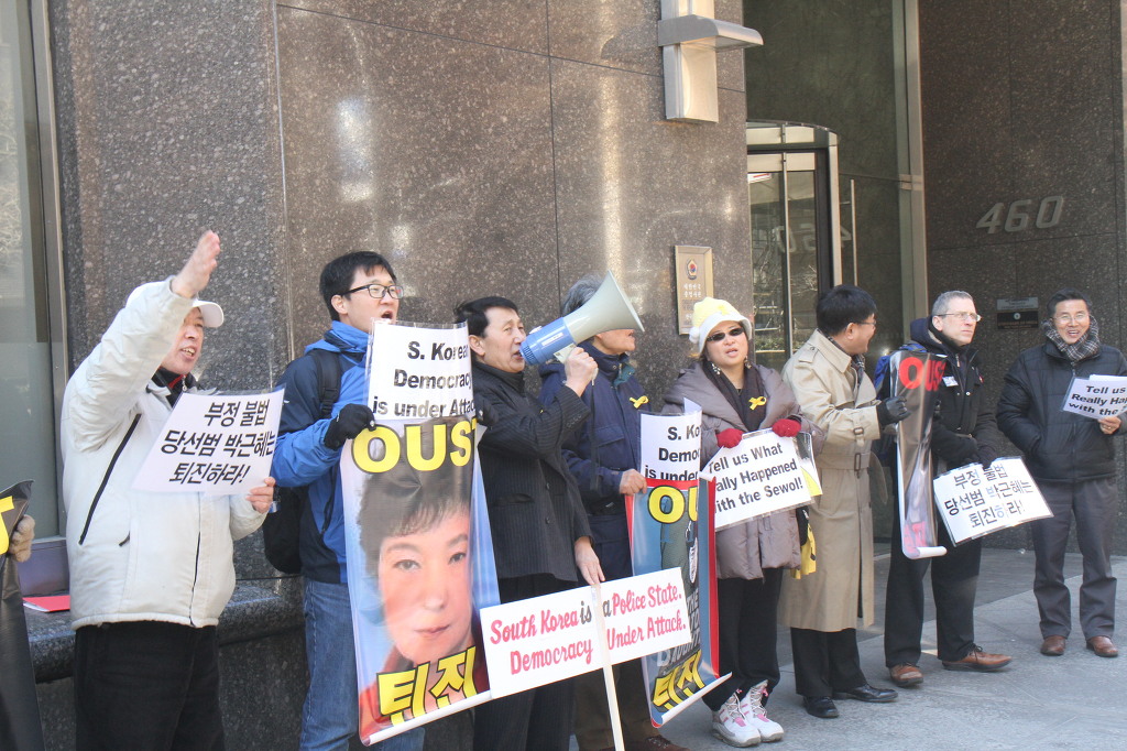 지난 28일 1시 뉴욕 맨해튼 파크 애비뉴 총영사관 앞에서 ‘박근혜 민주민생민족 파탄정권 퇴진을 촉구하는 재미동포들’ 주최로 열린 집회에 참가한 한인 30여 명은 ‘관권 부정선거, 이명박을 구속하고 박근혜는 물러가라!’ ‘세월호를 인양하고 특위 설립을 정상화하라!’는 구호를 힘차게 외치며, 추운 날씨 속에서 지나는 시민들에게 전단지를 나누어 주기도 했다.