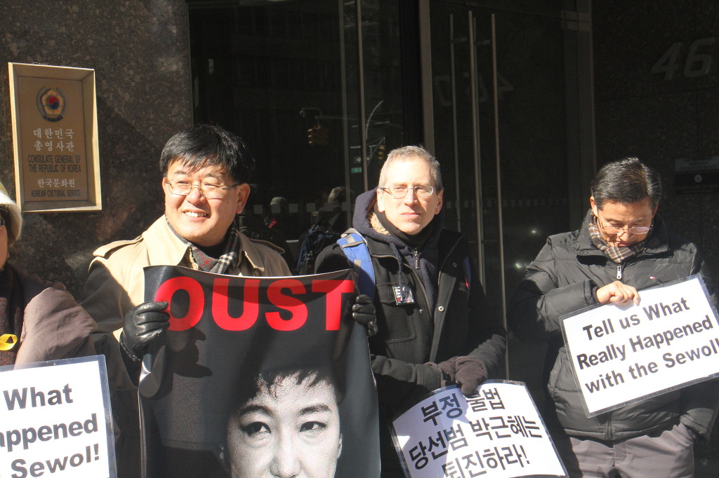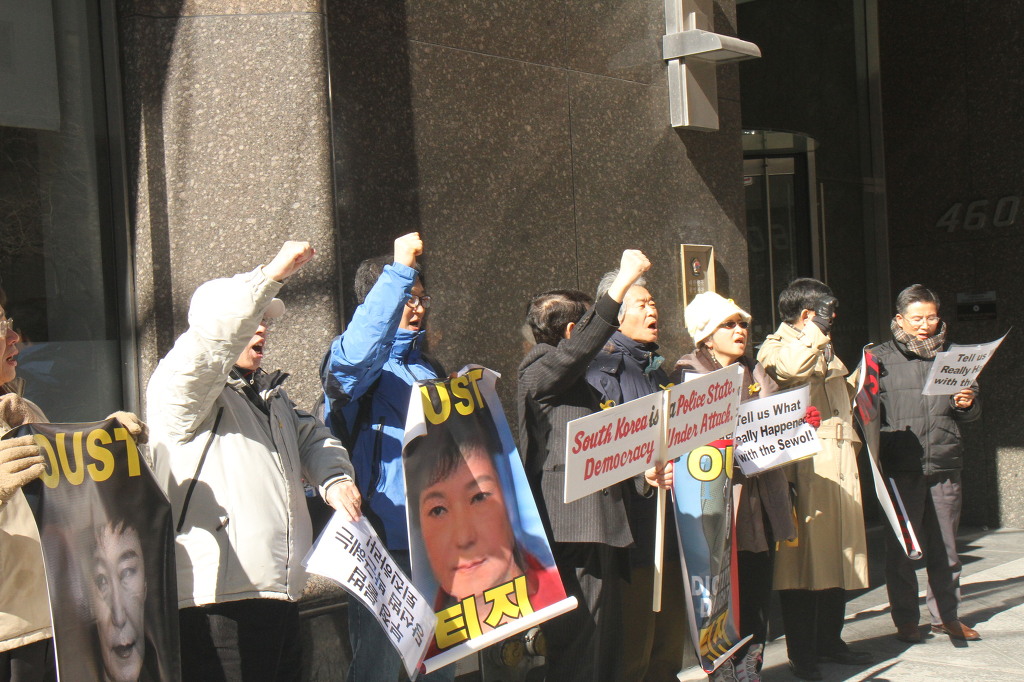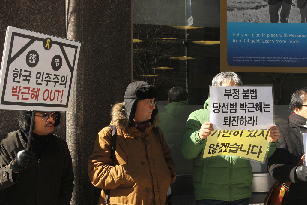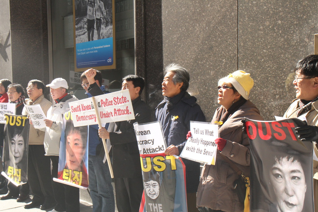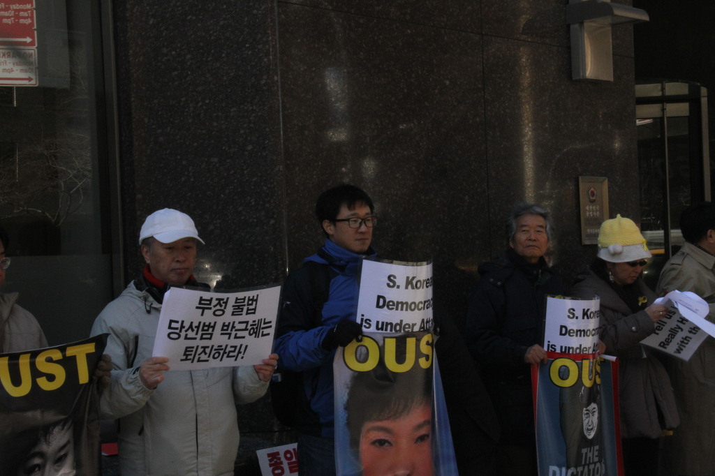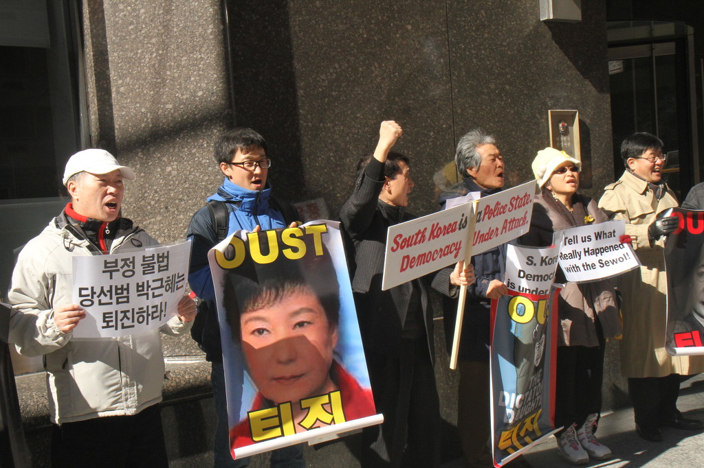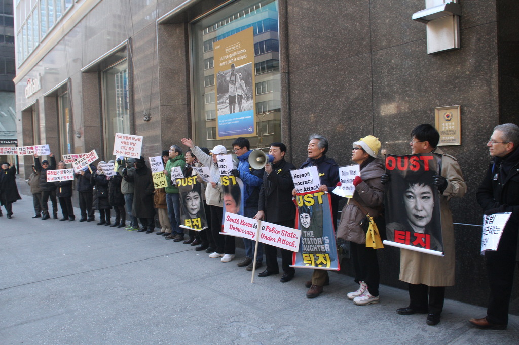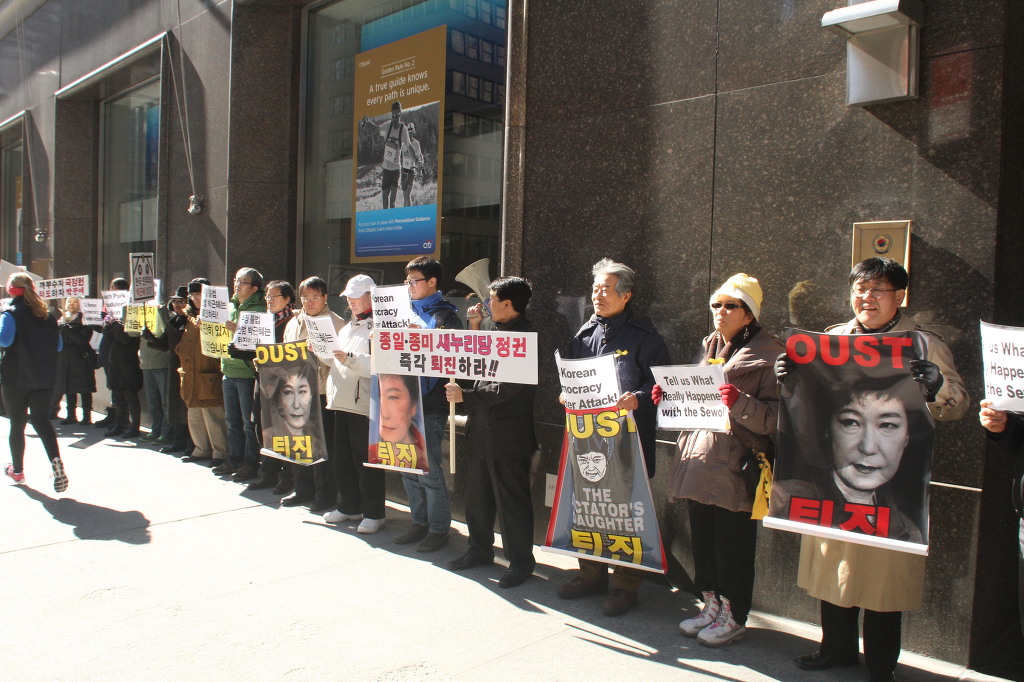 지난 28일 1시 뉴욕 맨해튼 파크 애비뉴 총영사관 앞에서 ‘박근혜 민주민생민족 파탄정권 퇴진을 촉구하는 재미동포들’ 주최로 열린 집회에 참가한 한인 30여 명은 ‘관권 부정선거, 이명박을 구속하고 박근혜는 물러가라!’ ‘세월호를 인양하고 특위 설립을 정상화하라!’는 구호를 힘차게 외치며, 추운 날씨 속에서 지나는 시민들에게 전단지를 나누어 주기도 했다.