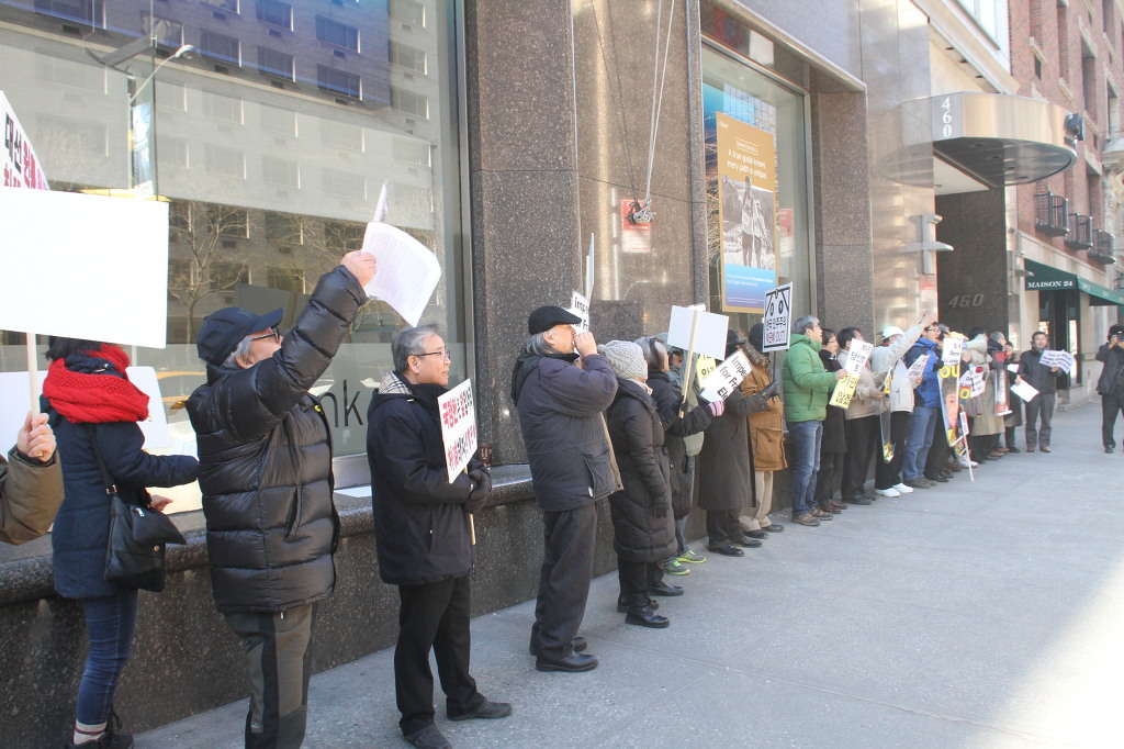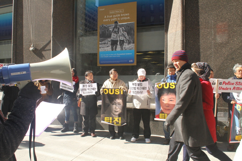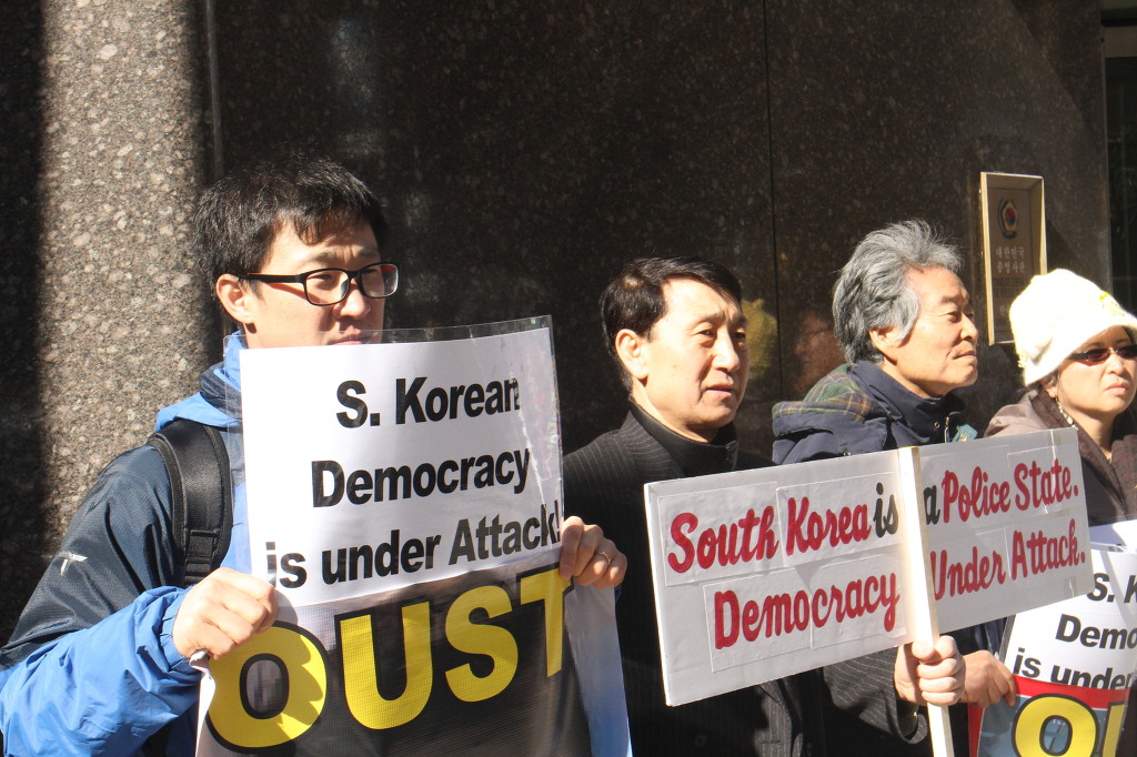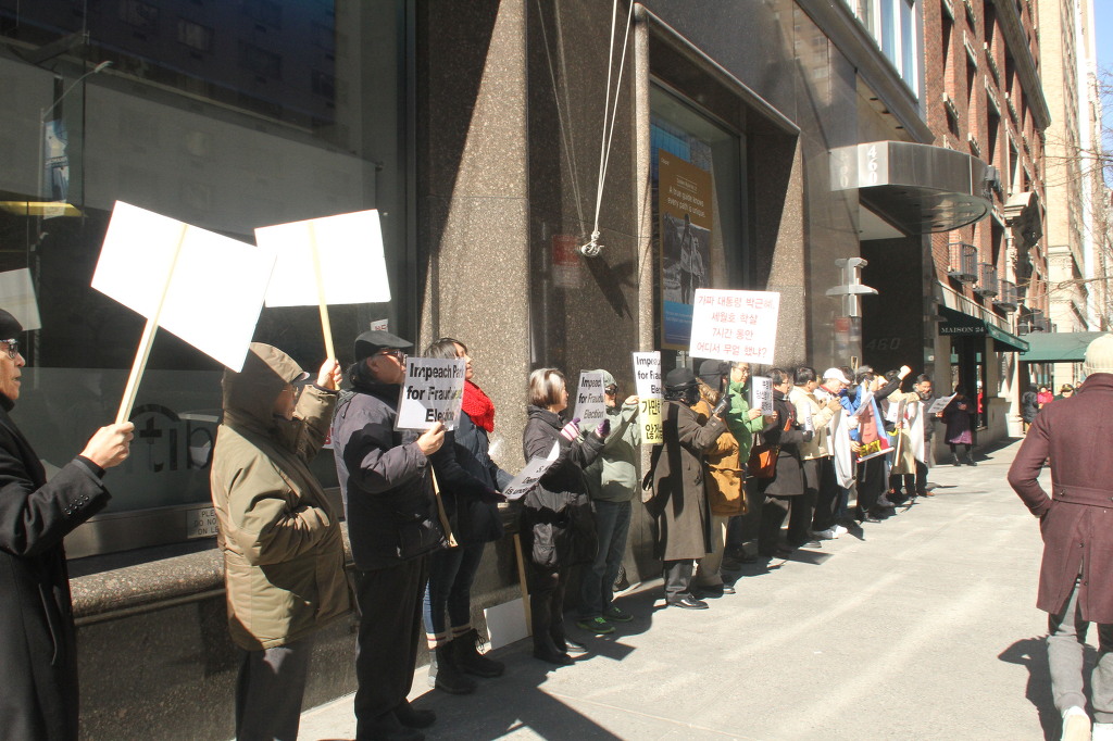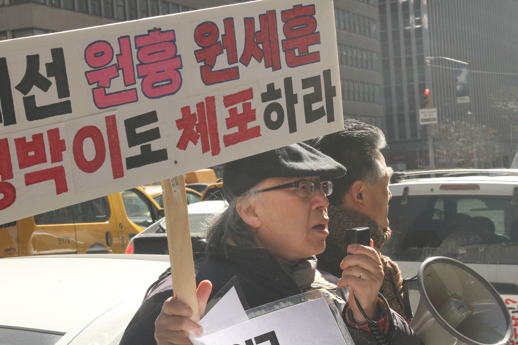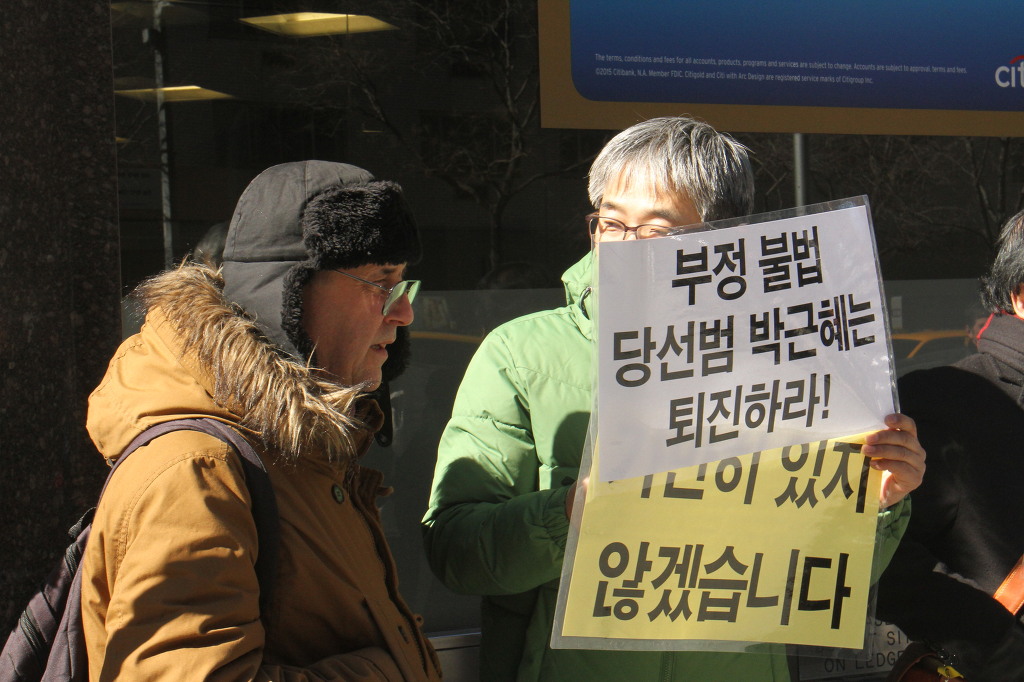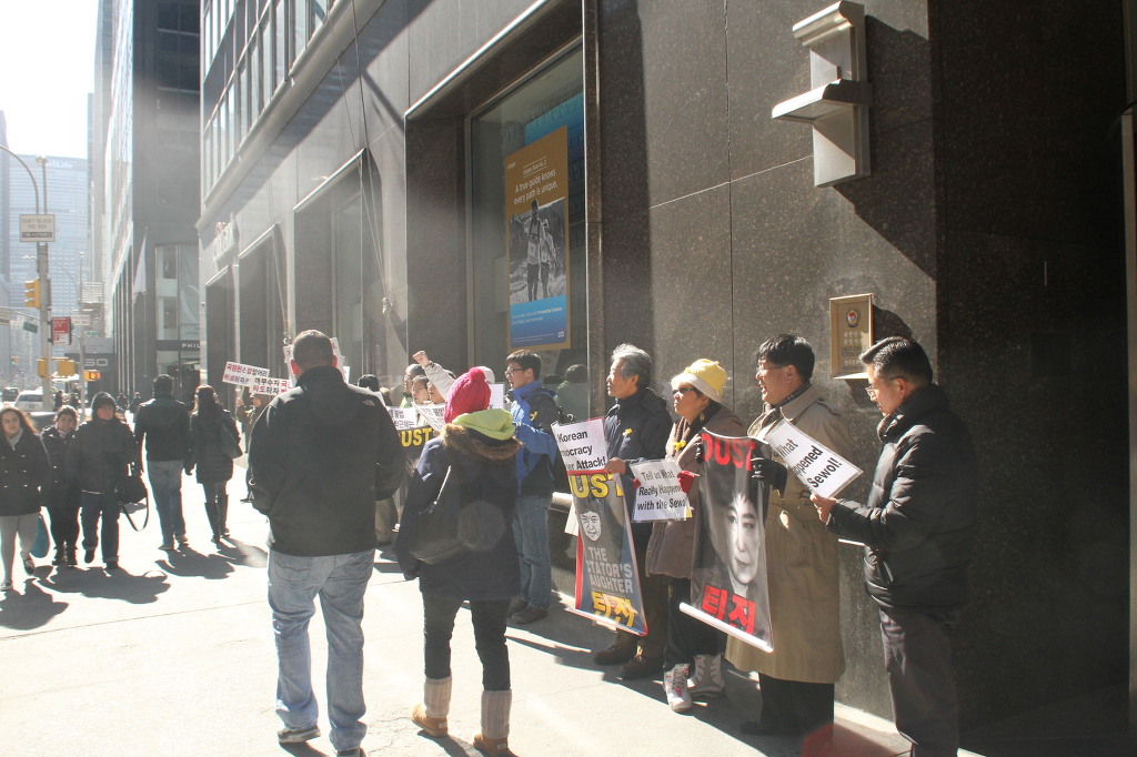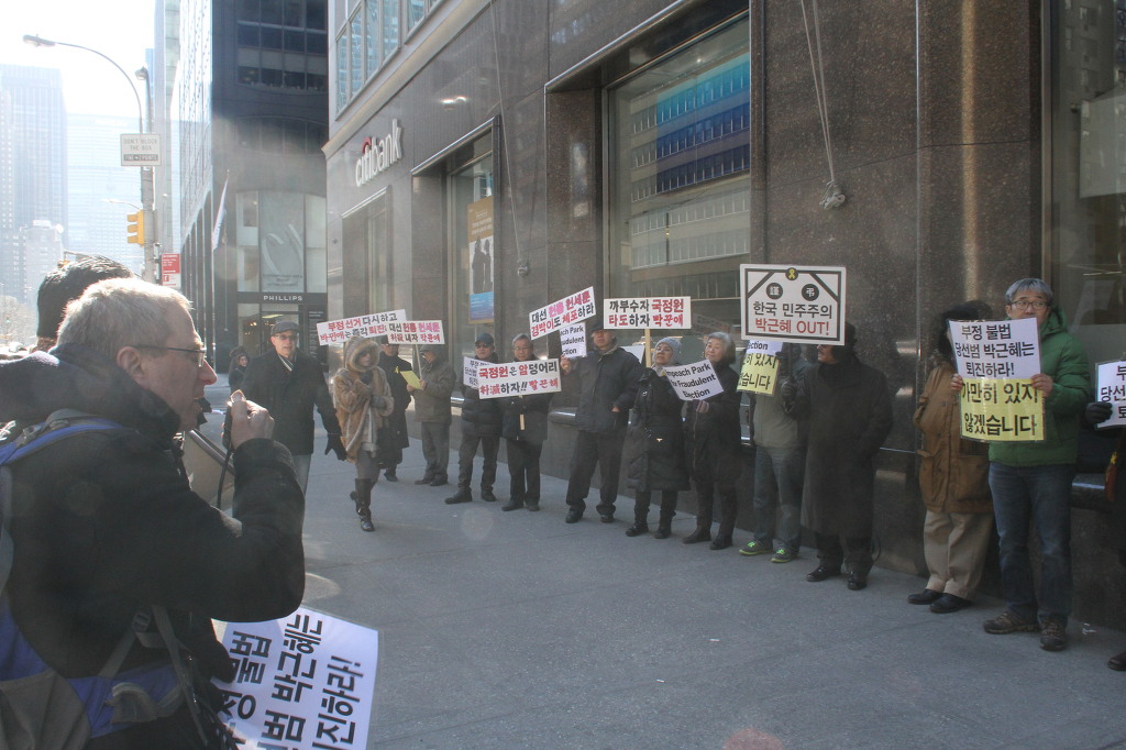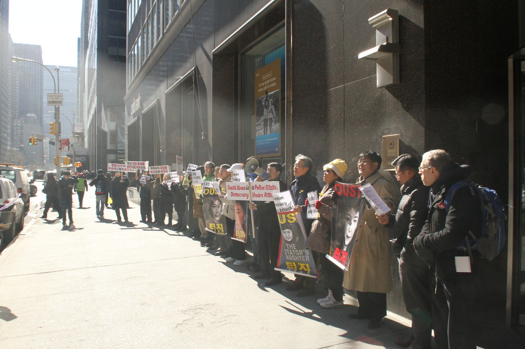 지난 28일 1시 뉴욕 맨해튼 파크 애비뉴 총영사관 앞에서 ‘박근혜 민주민생민족 파탄정권 퇴진을 촉구하는 재미동포들’ 주최로 열린 집회에 참가한 한인 30여 명은 ‘관권 부정선거, 이명박을 구속하고 박근혜는 물러가라!’ ‘세월호를 인양하고 특위 설립을 정상화하라!’는 구호를 힘차게 외치며, 추운 날씨 속에서 지나는 시민들에게 전단지를 나누어 주기도 했다.