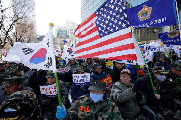 서울에서 한국 퇴역군인들이 마크 리퍼트 미 대사에 대한 공격을 비난하며 시위를 벌였다. 한국의 노년층의 많은 사람들은 미국을 구세주로 여긴다.