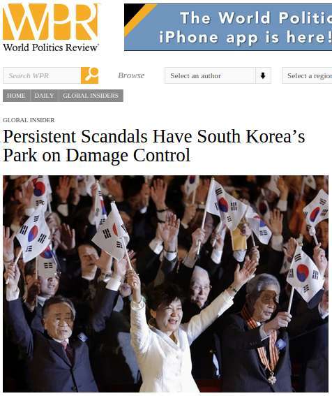 기사 바로가기 ☞ http://www.worldpoliticsreview.com/trend-lines/15240/persistent-scandals-have-south-korea-s-park-on-damage-control