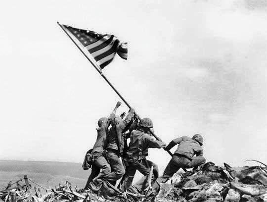 제2차 세계대전 막바지, 미군은 이오지마까지 육박했다. 미군은 이오지마를 장악하면 이 섬을 발판으로 일본 본토까지 넘볼 수 있었다. 따라서 미군은 이 섬에 대공세를 펼쳤다. 일본군 역시 이 섬을 빼앗기지 않으려 전력 열세에도 불구하고 끝까지 맞섰다. 미 해병대 대원들은 상륙 3일 섬 한복판의 쓰리바치 산을 점령하고 정상에 성조기를 꽂았다. 그리고 조 로젠탈은 이 사진을 찍어 본국에 타전했다.