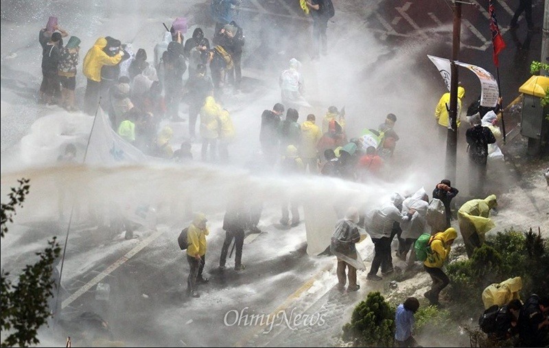 Water cannons containing tear gas were used at people during the protest. Many protesters