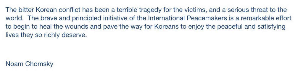 세계적인 석학인 매사추세츠 공대의 노엄 촘스키 교수가 오는 5월 24일 글로리아 스타이넘을 비롯한 30명의 저명한 세계평화여성운동가 및 노벨상 수상자들이 참가할 예정인 비무장지대 국제여성평화행진에 지지 성명을 보냈다. 촘스키는 하버드 대학의 한국학 연구소 연구원(Associate in Research, Korea Institute, Harvard University)이며 한국정책연구소 객원 연구원(Fellow, Korea Policy Institute)인 시몬 천 (Simone Chun) 정치학 박사에게 이메일로 이번 ‘판문점 종단’ 행사에 대한 지지성명을 전달했다.