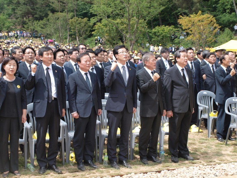 헌화 순서를 기다리는 문성근 안철수 전병헌 김한길 천호선 문재인 김무성