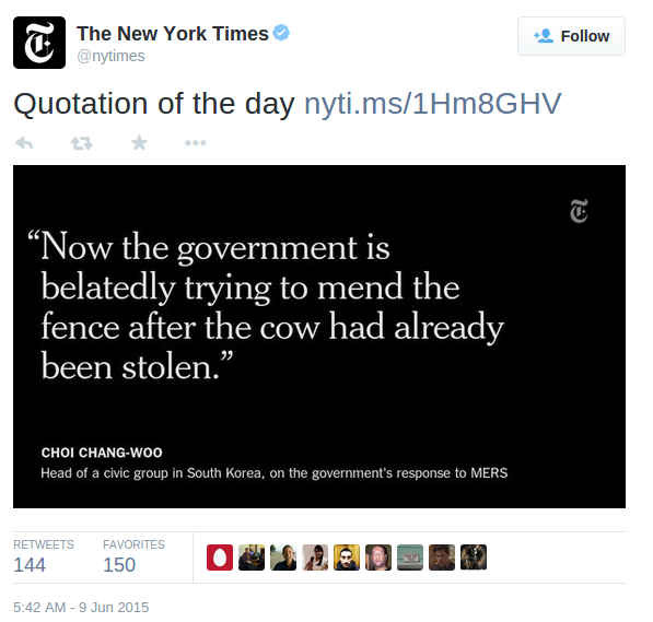 뉴욕타임스는 9일 자 기사 중 한 시민단체 대표가 메르스에 대한 정부의 대처에 대해 “소 잃고 외양간 고친다.”고 한 부분을 ‘오늘의 한마디’에 채택해 트위터에 올리기도 했다.