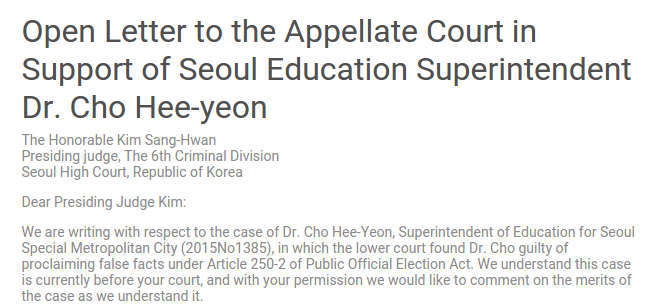Open Letter to the Appellate Court in Support of Seoul Education Superintendent Dr. Cho Hee-yeon