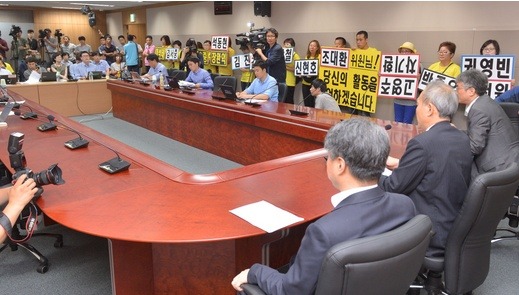 The families of the victims and their supporters are holding signs showing names of the panel members recommended by the government during a press conference on July 13. photo : Newsis
