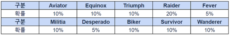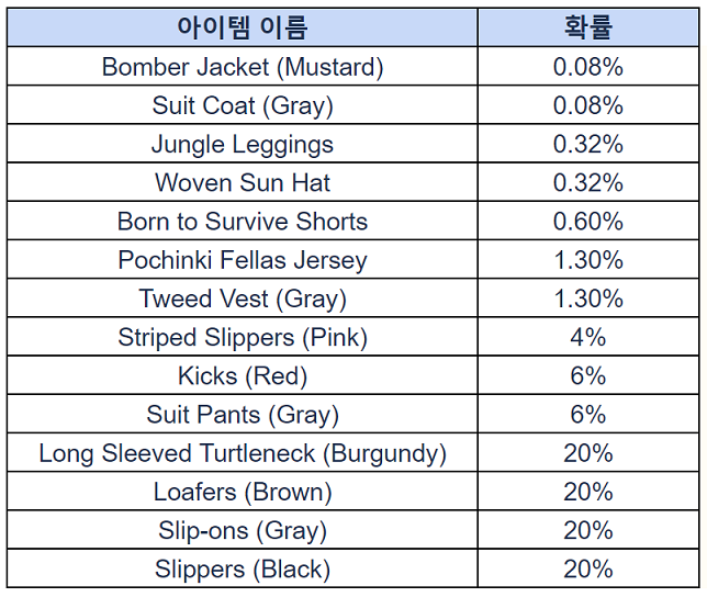 o신규 무료 상자에서 획득할 수 있는 아이템의 확률표는 다음과 같습니다.