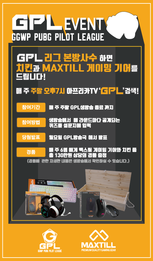 배틀그라운드 온라인 대회 GPL 시청자 상품 이벤트 ![]() | zx12mn09 | 1047 | 18.12.22 | - |